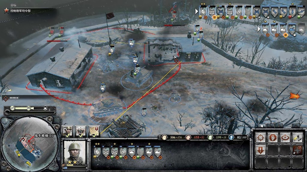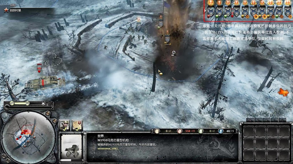 - 當德軍第一輛坦克出現在戰場上後,玩家得到命令撤回軍隊.按住Shift,在遊戲畫面的右上角依次點擊單位列表,選擇命令欄中的撤退.