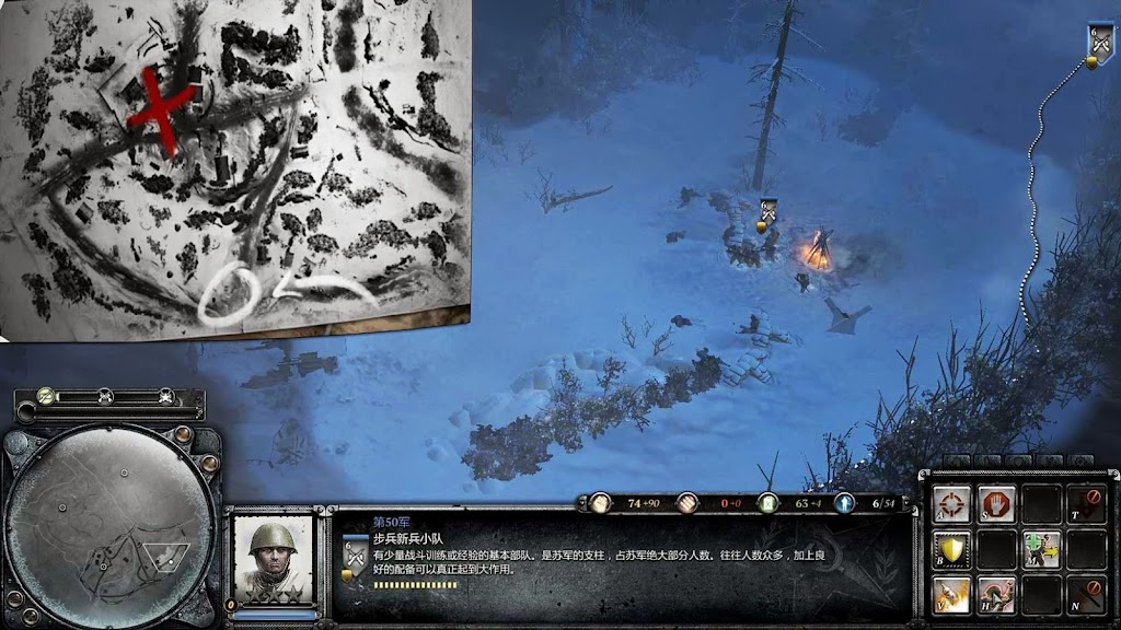 - 巷戰利用運輸車和新兵與對方的擲彈兵作戰,利用狙擊手的技能開視野,用迫擊炮轟掉所有反坦克炮旁邊的步兵.
