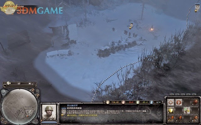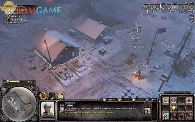 目標2:是時候準備防禦了 此時有4分鐘時間佈防,將所有兵力調派到河邊的掩體裏,派工兵到冰面和道路上佈雷。指揮部裏生產步兵,此前繳獲的火焰噴射器都裝備上。在左中右三個防守據點裏,各有一座火炮和重機槍,派小組操縱它們。防禦比較薄弱的是右路,增派兩組新兵到那邊駐防。