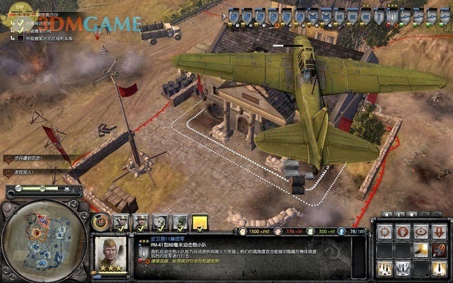接下來往地圖西北角的德軍總部行進,由東側切過去,清掉山丘上的駐兵,將反坦克炮擺到山丘上,居高臨下轟毀那幢指揮部建築,同時召喚戰鬥機實施轟炸。用迫擊炮朝大樓的西側轟炸,那裏還有最後一批德軍,有火炮和迫擊炮,清場完畢,跑過去佔領總部。