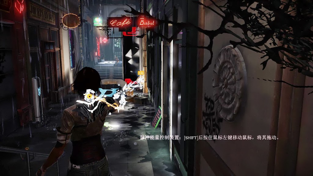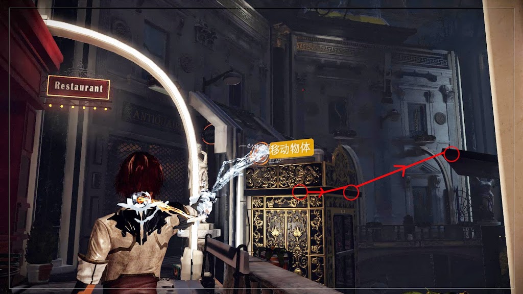 先來試驗一下自己從總督那裏奪取來的新能力,SHIFT瞄準後按住左鍵不放,然後可以沿著開關方向滑動滑鼠進行拖動。觀察地形可知這裏的污水導電性很強,所以需要把這個帶電體給舉在空中在通過。