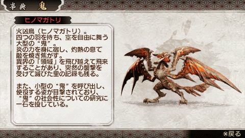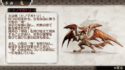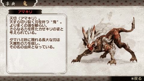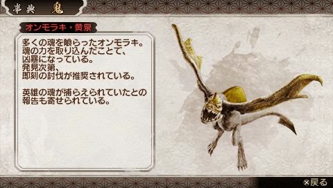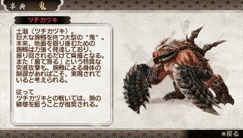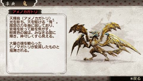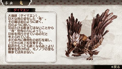 | オカミヌシ | | 淤加美主の硬腹甲 ねじれた大牙 氷炎竜 淤加美主の鬼角 大きな鬼角 拡瘴の大棘 蒼腕甲 蒼腕の刃棘 振武の豪腕 大竜尾 諦念のうめき 勇気の雄たけび 希望の凱歌 金眼四ツ目の鬼面 |