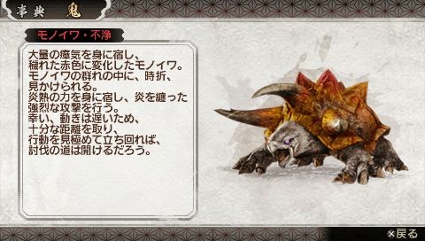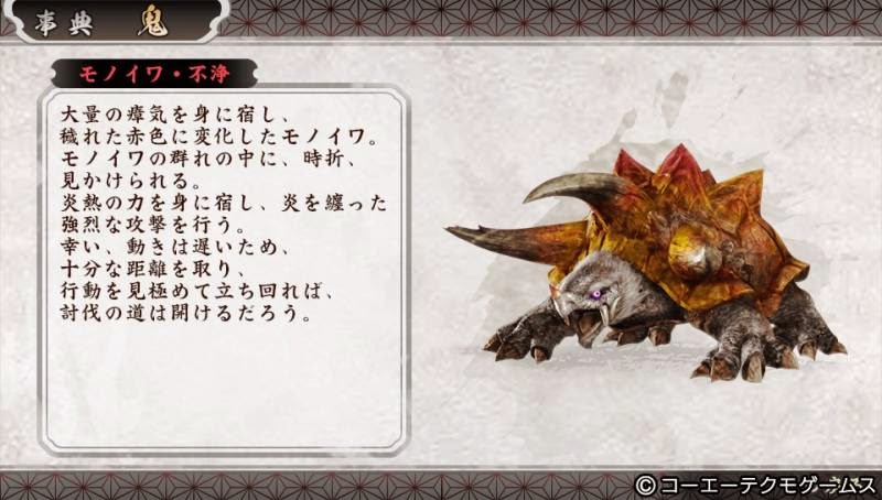 | モノイワ・不浄 | | 赤穢の甲羅 焦黒の突角 ねばつく泥土 変質した皮 頑丈な腹甲 謎の大牙 |