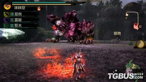 非常威武的炎鬼,攻擊力不是一般的高,好幾招都能直接打掉大半血,其中最具威脅的我認為是圖中這招甩尾。出招時boss會跳起並轉身,瞄準目標把尾巴甩過來,動作一氣呵成,準備時間並不長,必須在看見BOSS跳起的時候立刻向左右回避。