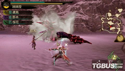 這只龜又是一肉山攻擊力高但是動作慢,不會跑來跑去,打著比較省心。每次見面它總是先來一招落雷和你打招呼,之後通常還會向前方直線發出催眠噴吐。落雷前兩隻角尖端亮起電光,然後在目標腳上以及一些其他位置的地面出現雷光(圖中左側鐮刀妹子腳上那個圈)。如果這招正在瞄準你,那麼就不停走動吧,要注意前方地面有沒亮光就好;如果目標是跑遠了的其他人,其實還可以沖過去砍BOSS幾刀。