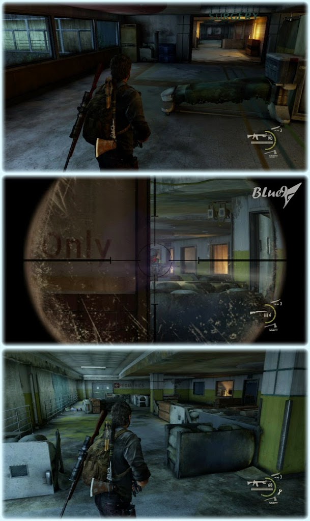 2樓盡頭跳下進入1樓的孢子區,這裏感染者不算很多但有一個巨無霸(他身上有一個火螢垂飾),可以悄悄過去,到出口的大門後往遠處扔一個瓶子引走他們再開門(因為這個門需要QTE所以不能馬上打開) | ||