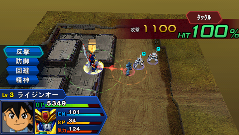 一開始雙方都處於同一個平面,推薦玩家選擇其中一台イングラム 登上高臺之後再進行攻擊,第二回合我方加入ライジンオー,攻擊很高,所以戰鬥會變得簡單很多。注意,敵人會使用讓我方強制退後一格的招式,所以玩家要考慮好武器的射程