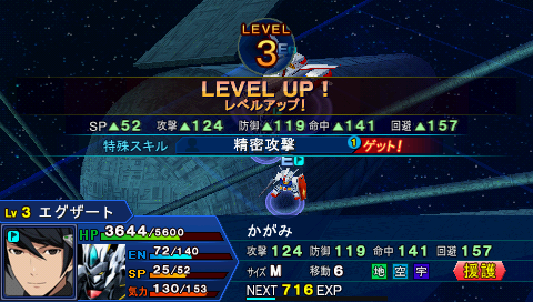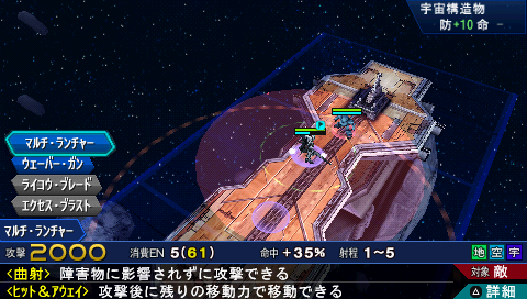 1號機的【ワイヤー捕縛】十分好用,在我方回合的時候,使用這一招攻擊敵人時,敵人陷入捕縛狀態,敵人的反擊無效,並且敵人的命中、回避減少20%,被會心率上升8%,而且其特性還可以無視障礙物的影響。一開始主角比較接近敵人,而且敵人處於高地,推薦主角先站到與敵人同一高地之後在使用ウエーバー•ガン 將其打殘(前提還是武器已經升1級),之後派1號機進行打掉,之後都十分簡單。