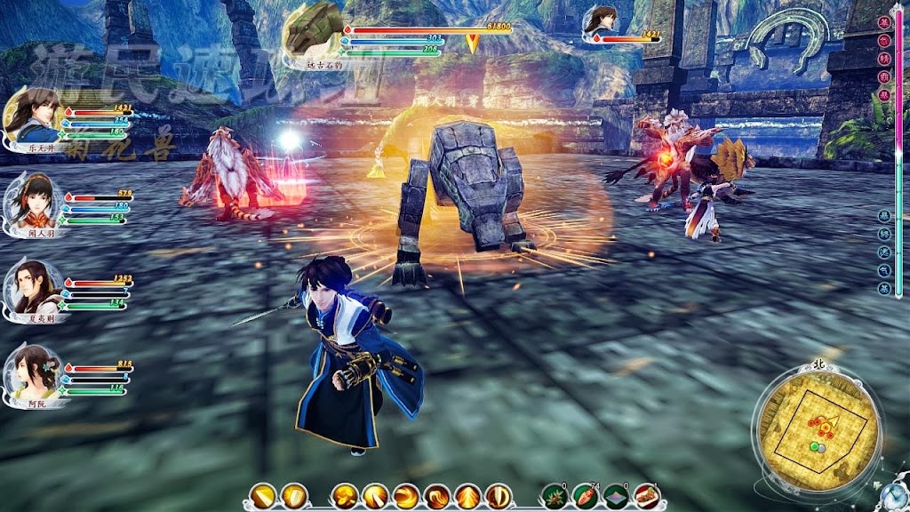 進入這張地圖之後,一開始是一段qte,之後進入boss戰,這個boss不會動的,很渣。目前我各主角等級都是40上下,主力輸出是夏夷則和樂無異,聞人羽基本上在這一戰中廢了,不要跟他近戰,不然他的技能不好躲避,聞人羽就用萬箭、樂無異砸錢、夏夷則雲龍擊,阿阮在後方輔助,注意躲避技能即可,這傢伙的技能都比較慢,所以很好躲。