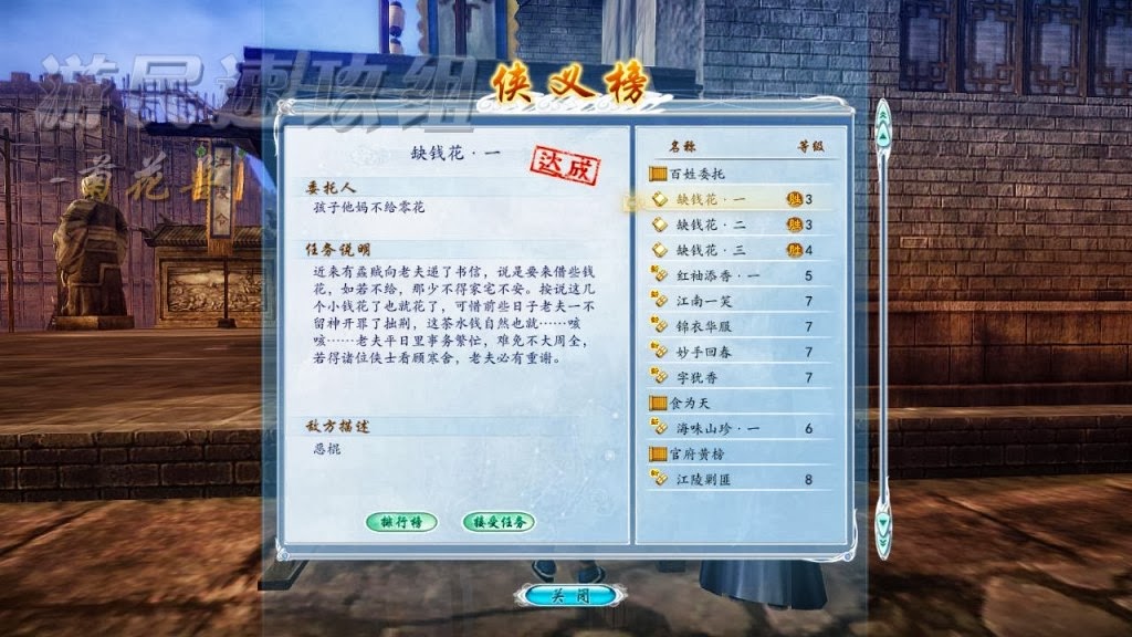 第二個任務是缺錢花•二,敵人是3名飛賊,要打這個的話,還是一開始就得跑,他們的攻擊有些遠端,等集中到一起,他們準備近戰打你的時候,過去用新月連環,之後隨便怎麼打。