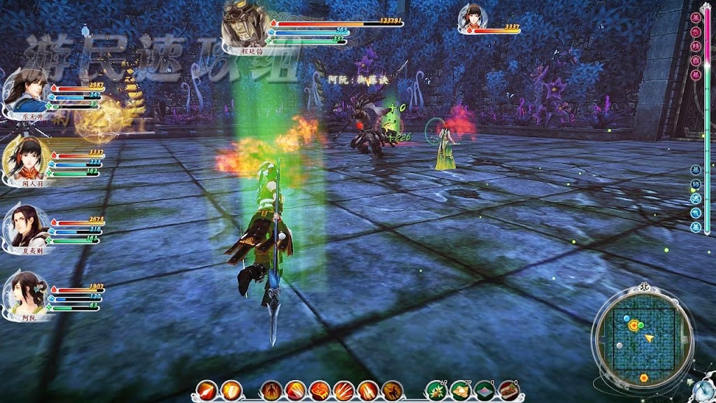 一出來我們這邊的陣型,4個人分為2組分別把怪物夾在中間,小怪基本上可以無視掉,先說這個BOSS,70000左右的血,比較耐打,屬於是高攻高防高敏但是智商低下的類型。他有3個主要技能以及普通攻擊,分別是:古藤異甲(純屬站著讓你打的技能,他一放這招你就砸錢)、吐霧(在霧中他會很強,並且會回血,而且會一直放裂石分筋)、裂石分筋(衝刺技能,傷害十分高,他放這招的時候看准他的方向來躲避,一次完了立即靠近他放流影劍)。之前說的,流影劍,主要不是為了輸出,主要是為了抵消他所回復的血,但是最主要的目的是,躲避他的裂石分筋,吐霧狀態完了之後就不能再放裂石分筋了,等著他放古藤異甲然後你砸錢,一般到戰鬥後期就只能樂無異跟他單挑,其他人就醬油了。反正他就古藤異甲-吐霧-裂石分筋無限迴圈,咱也無限迴圈,砸錢-回血-流影劍,一套流影劍結束剛好霧散去!