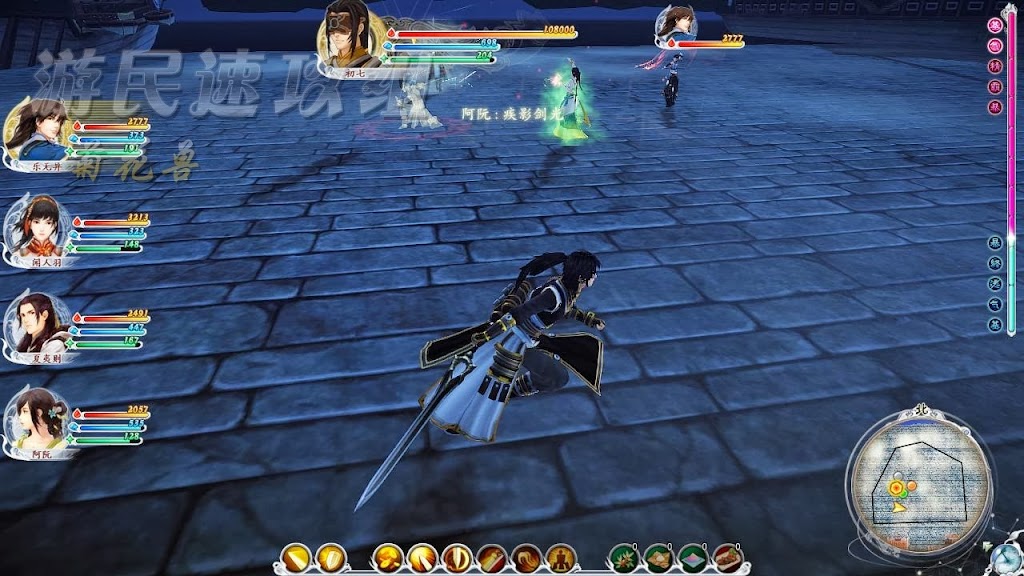 第二戰,這一戰主要靠樂無異輸出,樂無異的武器變為昭明,其他人的輸出對於他來說跟撓癢癢差不多!樂無異不要與沈夜正面衝突,從背後,用撥雲見日,這招對付現在的沈夜傷害已經算很高了,他的藤條爛完之後,他就不會動,然後會慢慢修復藤條,但是他自己也會回血,此時要加強輸出火力。這一戰很容易卡住一個bug,就是沈夜打著打著就不動了。