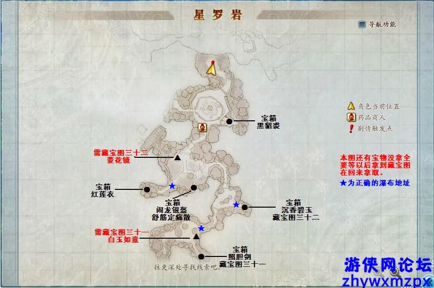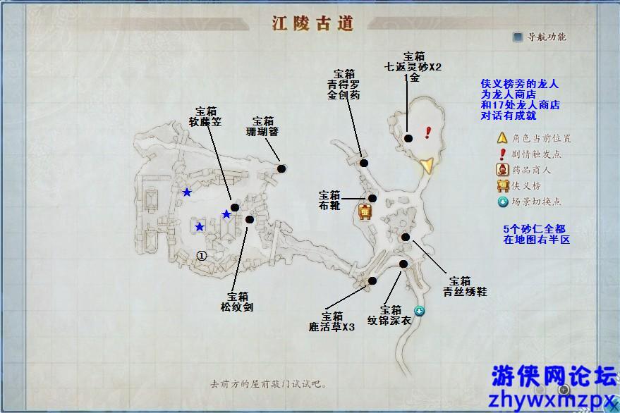 上為各處搜寶地址,靜水湖現在不對外開放寶物拿不到,來到非夜晚的郎德寨,可以看到兩個支線。