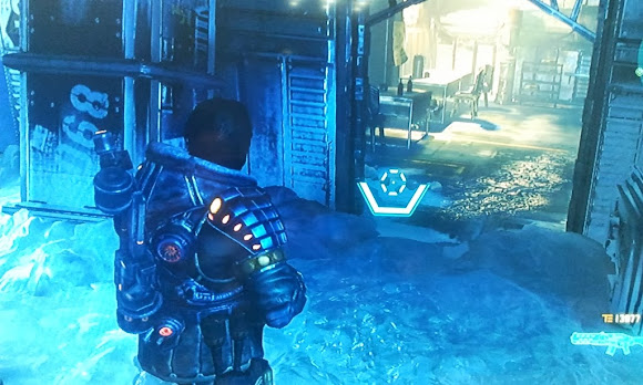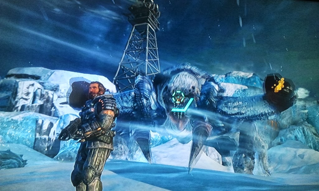 5.從大門出去發現有個人在破壞系統,之後跳下懸崖。前進至系統處,將系統修理好後進入劇情。劇情後會出現巨大甲蟲BOSS,其攻擊方式為快速衝擊,以及用爪穿刺攻擊。甲蟲的爪穿刺到雪地時會有一段拔起時間,所以首先攻擊甲蟲兩側的爪子,之後攻擊甲蟲背部的尖刺,甲蟲在衝撞的時候按A鍵+搖杆向兩側躲避,最後攻擊甲蟲背部發紅的地方。由於甲蟲氣血比較多,所以使用步槍即使將步槍的子彈用光也不能將其完全擊殺掉,在控制室的兩側有2個彈藥補給,步槍子彈用完時進行補給操作。