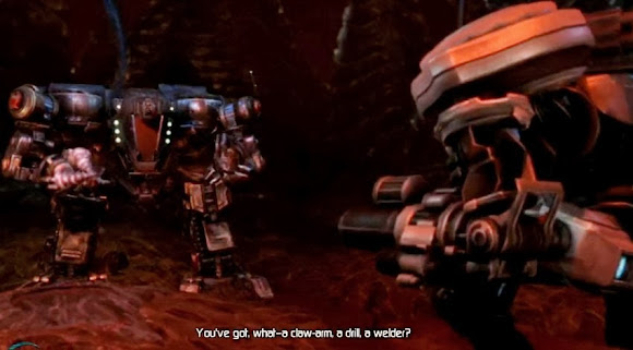 6.從電梯出來到一層後與加爾進行短暫的交流,之後可以從旁邊的商人購買武器刀和槍,之後便可與加爾一起前往二層觀看機器人。通過繩索進入機器人體內,完成系統給與的按鍵指示,抓取、電鑽、防禦等操作