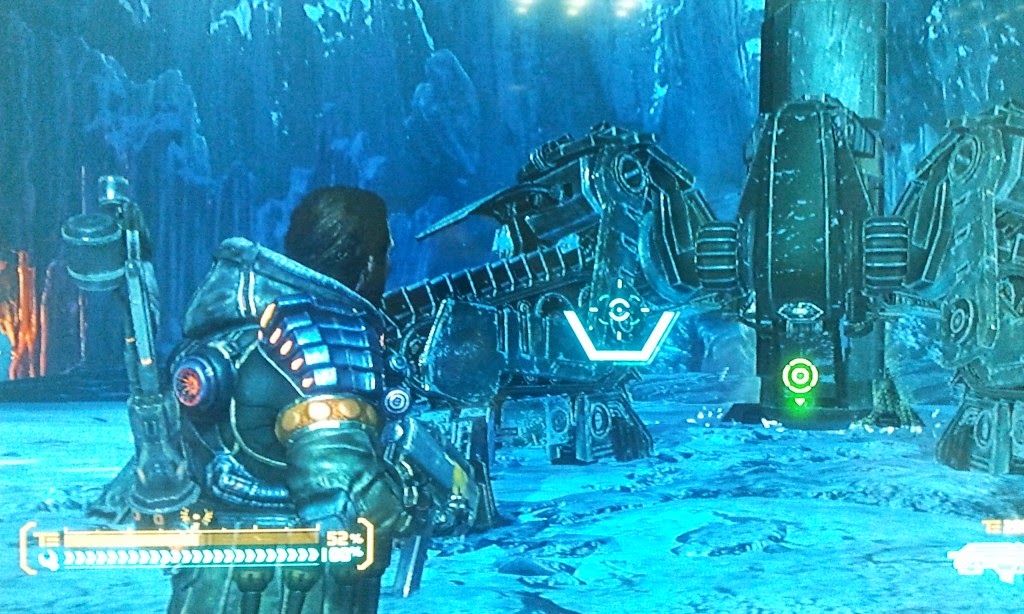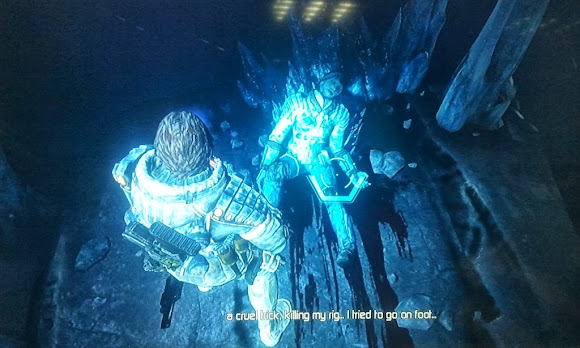 3.繼續往前走然後遇到飛行器的殘骸,劇情後出現一群烏賊與冰豹,躲避在石塊處還是被衝擊的冰豹發現,之後猛按A鍵掙脫束縛,危機時刻被之後被趕來的機器人所救 4.之後與隊友回合,正在鋸開冰牆的推土機被冰錐砸到,導致頭部損壞。這時出現大量烏賊,使用手槍可以輕鬆擊殺掉。之後來到推土機的頭部按X鍵,會出現三個紅色表示,調整左右搖杆,使得紅色表示變為白色標識就表示維修成功
