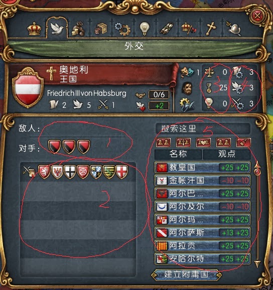 奧地利初始就是帝國皇帝,下面是7個帝候選,你要不停的和他們外交改善關係,保持威望,幫助他們抵抗侵略,抵制異教徒,對外作戰