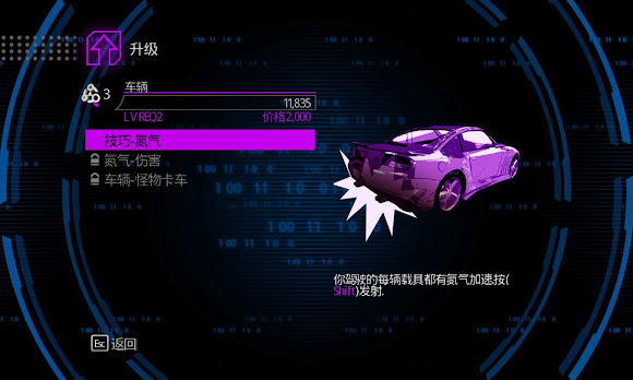 升級車庫中的車輛,讓你的車從此走上高性能的道路,其中要解鎖氮氣。氮氣可以提高車輛的形式速度而且具有一定的攻擊性。