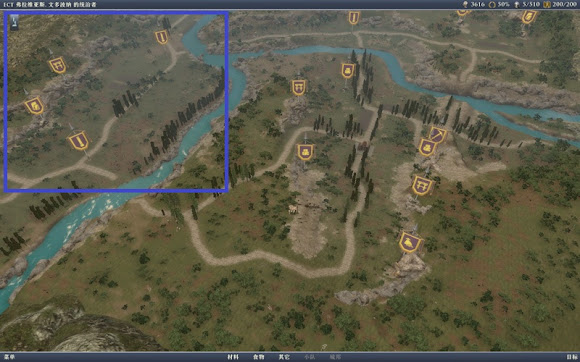 在初期建立了基本的資源供給鏈後就要快速的向地圖西方殖民(藍色方框區域),西部大片的空地更適合城市的集中規劃。