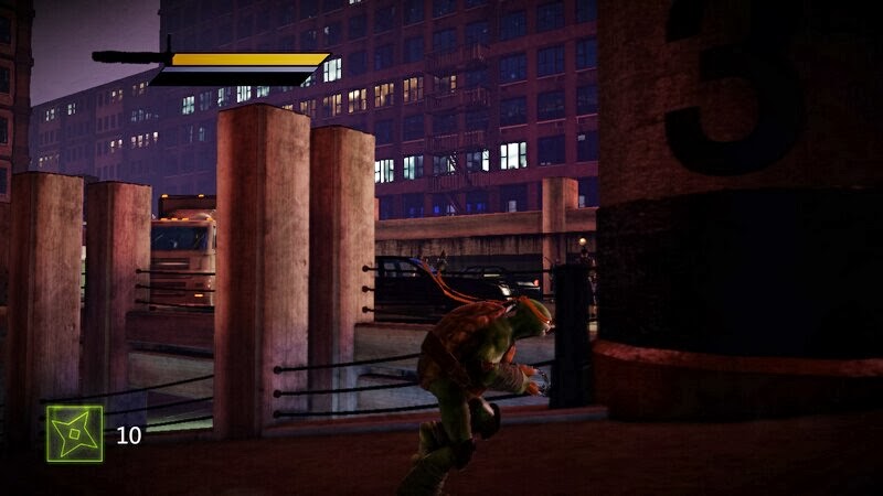 本關為訓練關,April在路上遇到不明歹徒的襲擊,被炸翻到了一旁的建築裡,由於平日和Master Splinter接受過一些基本的訓練,這些情況還是能應付的。開始可以按住RB來加速跑動,方向+A可以閃過一些矮小的洞和狹小的地方,還能跳躍過電水池。