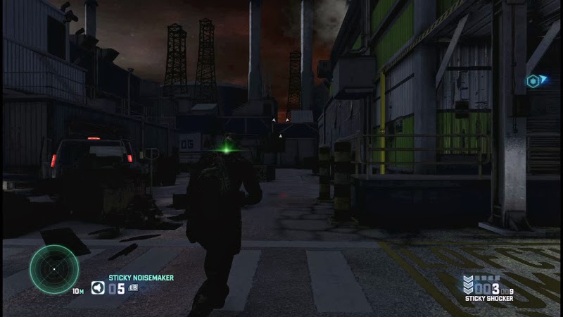 step4.費舍爾進入廠區後,爬上兩輛大卡車中間的綠色廠房左側的黃色水管(遊戲內的目標地點標識有可能出現錯誤),沿著邊緣登上頂棚並進入“05”廠房的辦公室。