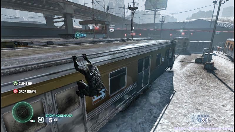 爬上初始位置左側的綠色水管來到二層的鐵樓梯上,來到鐵棚架的右端,翻過護欄落到一列火車頂蓋上(注意狙擊手)。