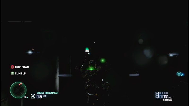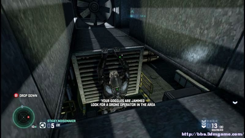 此時費舍爾才從通風槽外出,使用夜視鏡,會發現通風槽對出的坑中可以看到下層一名“抓捕目標”。