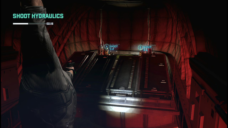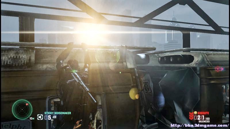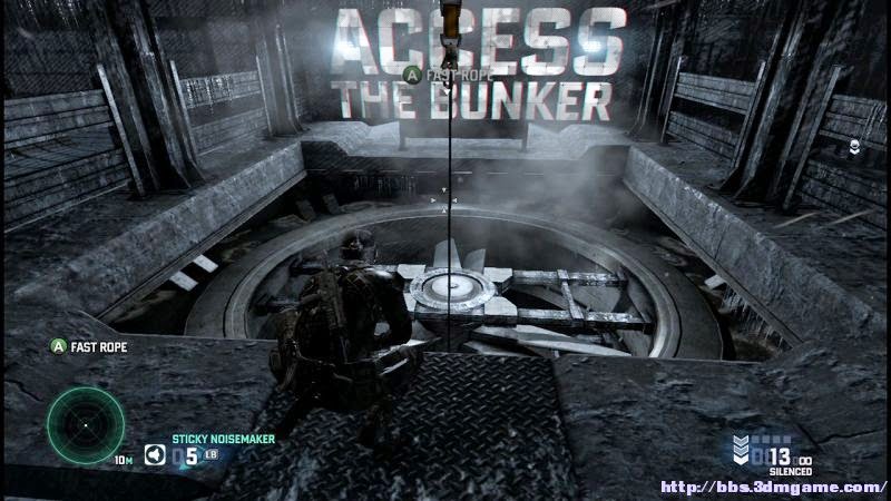 再等待下層的敵人離開後“馬上”繩降到停車場的底層,因為當這名敵人離開後,後方敵人的電筒剛好會落到費舍爾所停留的這層夾心層上(不能夠耽擱)。