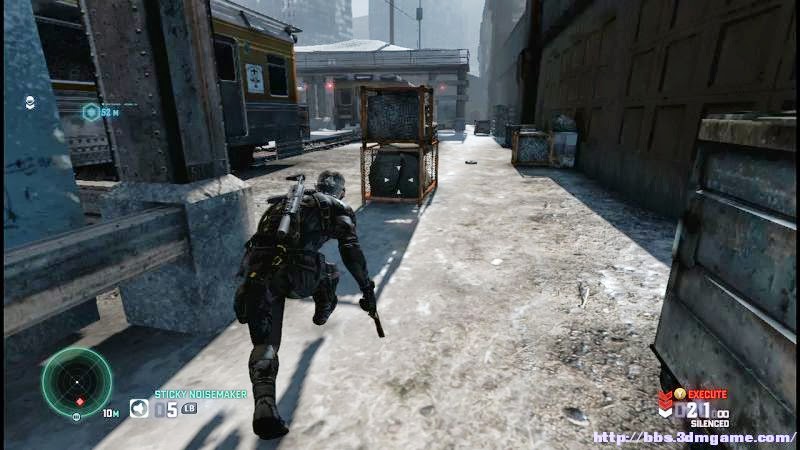step5.從辦公室左側的鐵欄翻到地面就可以正式進入廠區內,前面有兩條路(往上層走,往下層走),選擇走下層的話,敵人只有兩台遙控車,只需要先為它們標記一嚇就可以了輕鬆通過貨物間的窄道、高位邊緣躲過它們的視野(上層就是敵兵,相對比較麻煩)。