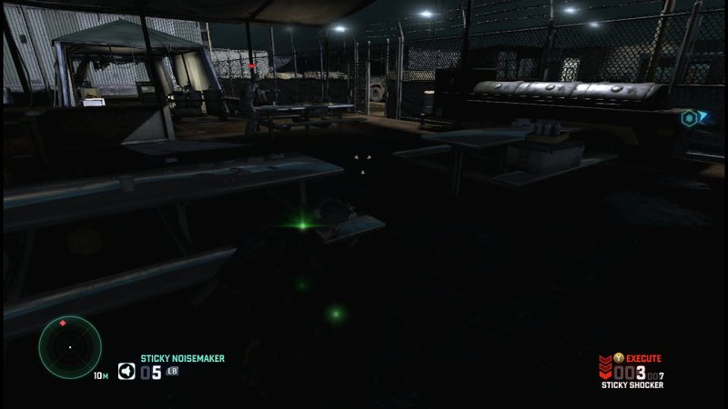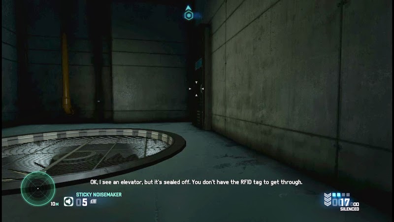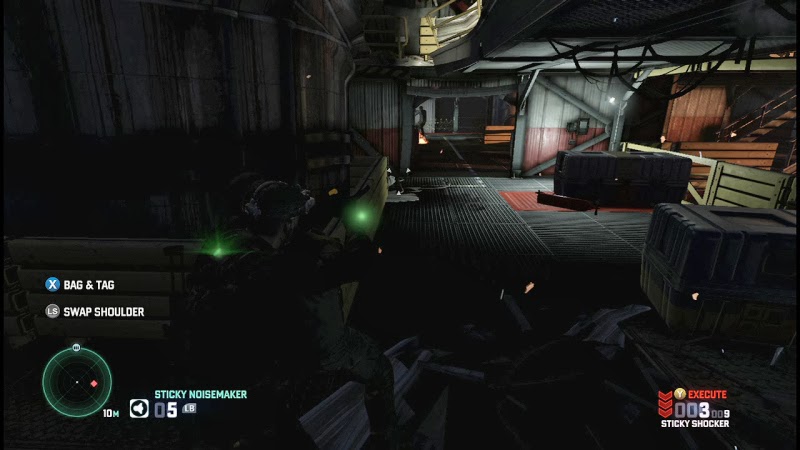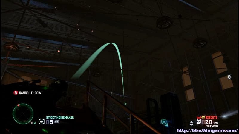 然後從走廊來到控制室最後一道門(靠近排風控制器),往對角扔出一嗰噪音彈,然後布裡吉斯就可以溜進去關掉排風控制器,然後從平房的後門離開。