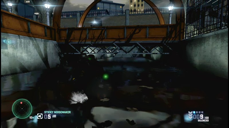 step9.不選擇從兩條橋通過,費舍爾落到一條小河裡依靠著右側陰影較多的邊緣往右側的橋樑底部走過去(因為左側的小橋上有只獵犬)。