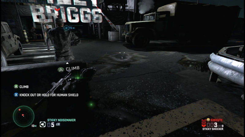 step9.(玩家重新控制費舍爾)走在地堡外頭,當看見綠色雷射燈已經找准前方兩名敵人的頭部時,馬上按X鍵奪取挾持費舍爾的一名敵人,而前方除了薩迪,所有敵人都被擊斃。