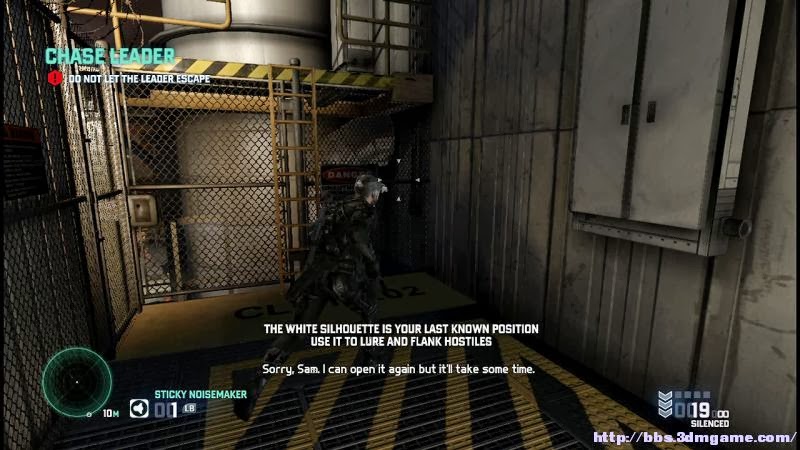 檢查鐵門的敵人過一會兒就會往後方走去,那麼就馬上走到手提電腦前進行駭入,不必理會那嗰在旁邊正在維修的敵人(那名因視野受阻無法查看性質的敵人)
