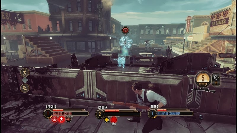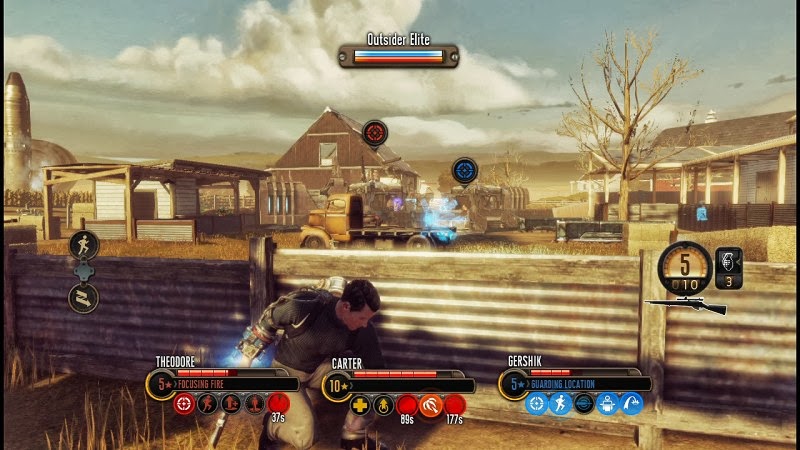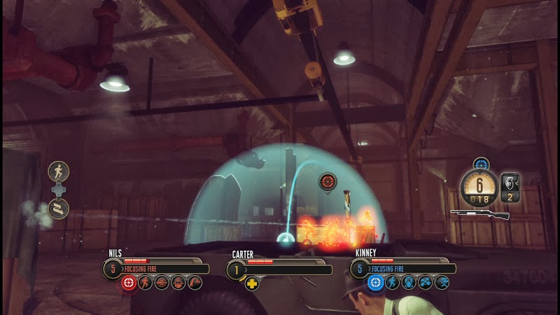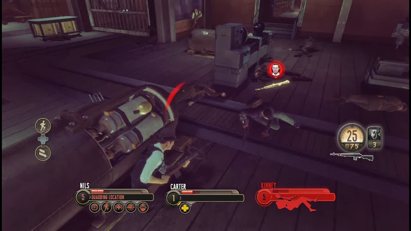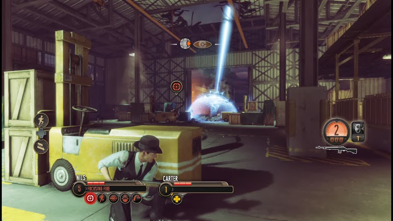 先讓卡爾特沖到右側的掩體的端端,吸引機關炮的火力,到時候按B鍵進入命令輪盤,用左搖杆選擇“行走”(move)讓尼爾斯走到左側再選擇“特定射擊”攻擊機關炮。
