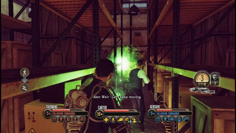 走進倉庫的二層(地板上可以撿到一把M14機槍),按動四方框玻璃上的閘門按鈕開啟一樓大門(此時遊戲出現了本遊戲的精髓——緊急命令的簡介:安排助手行走/射擊以達到團隊配合的作用。),然後打開四方框玻璃上的窗子對樓下的矮小外星人進行射擊。