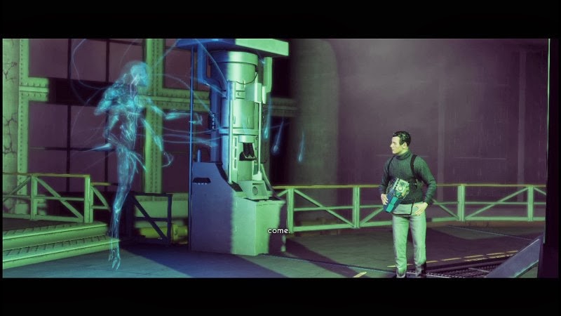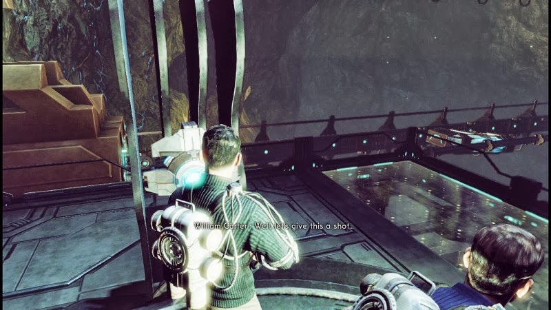 step5.先往威爾所在的右椚走去,經過一條半透明橋並搭乘移動板來到了sectopod的生產基地。