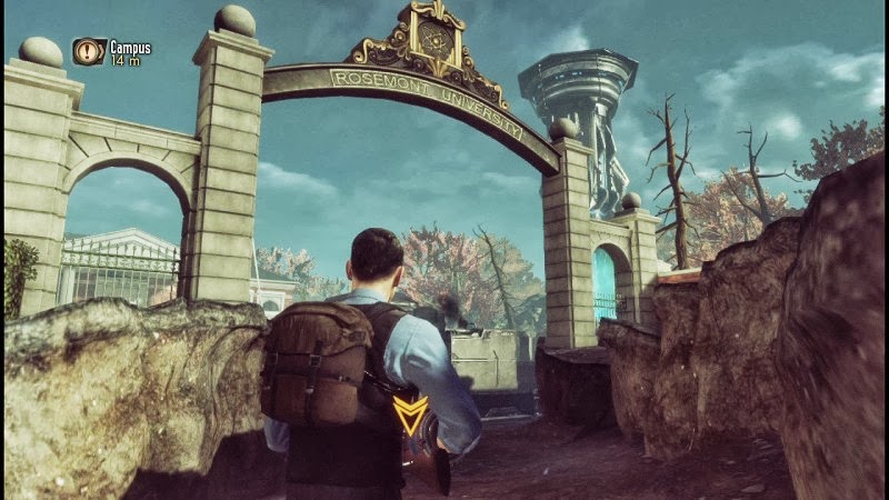 step6.外出升降機進入左側的建築內,在右側第一間保安室的監控前拾獲一封信。返回剛才的走廊在前方的障礙物上獲取彈藥包後進入右側的通道,在一嗰演講壇前的簡易書桌上查看一幅“草圖”照片,在講壇上查看“EI元素”的解釋圖。進入講壇左側的玻璃小房間內也可以查看一幅“黑板”照片,然後從小房間的左側離開,從走廊的玻璃可以看到實驗室內站著一名男子,然後繞到右側的前門進入。