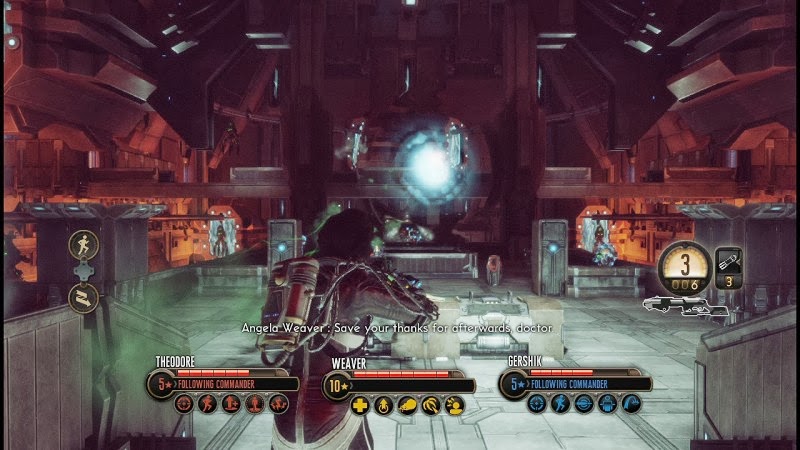 step11.來到意念擴展器前,會遭遇到三台加強版muton和三架戰機(陸續出現),先讓三人一同移動到左側的房間內作為據點對敵人打擊。