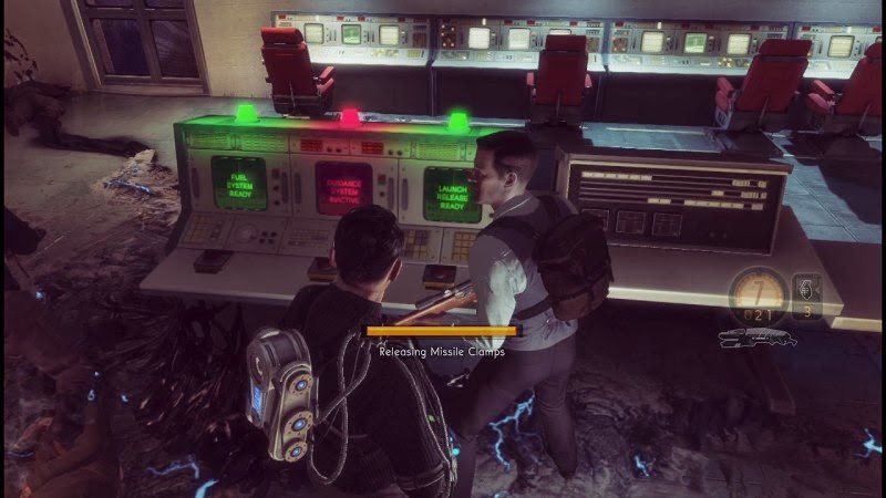 step1.來到地面穿過剛才在鋼架通道看見的光球的後方的破爛小巷,來到一處導彈停放點,前方會迎來四名外星人,按B鍵進入指令羅盤,讓尼爾斯進入左側的小平臺對左側的敵人射擊;讓金尼進入右側帶頂棚的小平臺對右側的敵人進行射擊;卡爾特就負責中間的敵人。