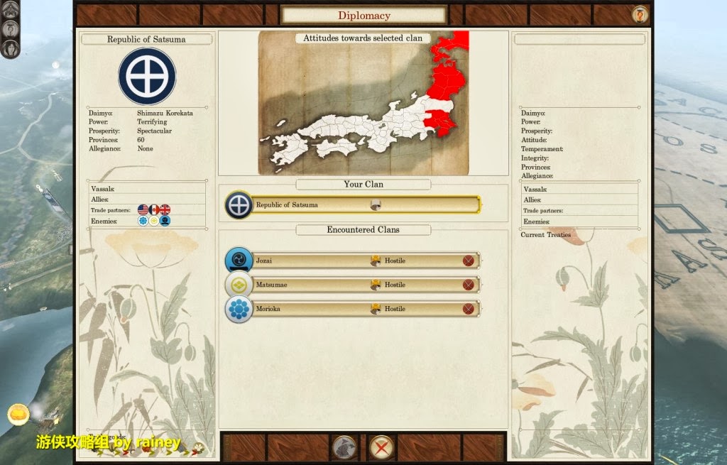 幾大家族中,島津的戰略位置最為有利。可以避敵鋒芒,養精蓄銳。是初級和中級玩家的最佳選擇。