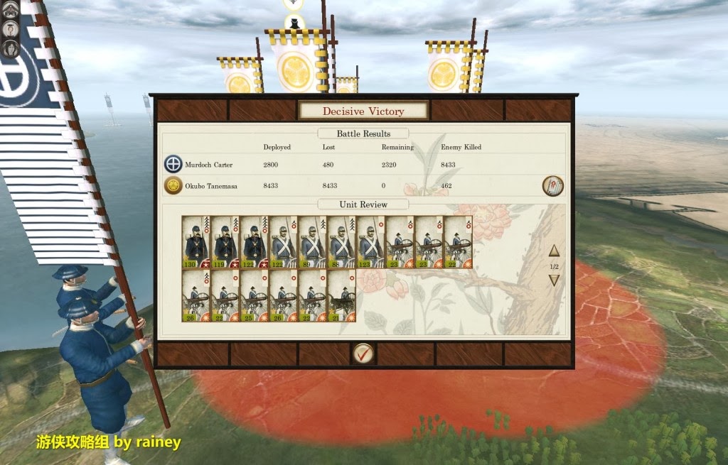 很多戰役都是以少勝多,不要用自動,你的實際優勢再多,電腦都會玩死你……呵呵,戰績還是不錯的……雖然有才的將領竟然被敵方忍者暗殺……靠~心中不平啊~