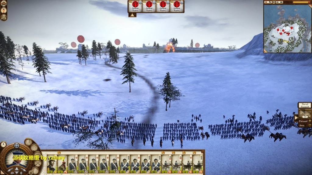 典型的攻城戰戰法,雖然地方也有炮。不過都在天守附近,不會對我軍造成威脅。我方把火炮設立在城堡周圍,上來就不停的炮擊,炸亂敵人的陣腳。接著如果還有殘餘的敵人,就用步兵將他們全滅。