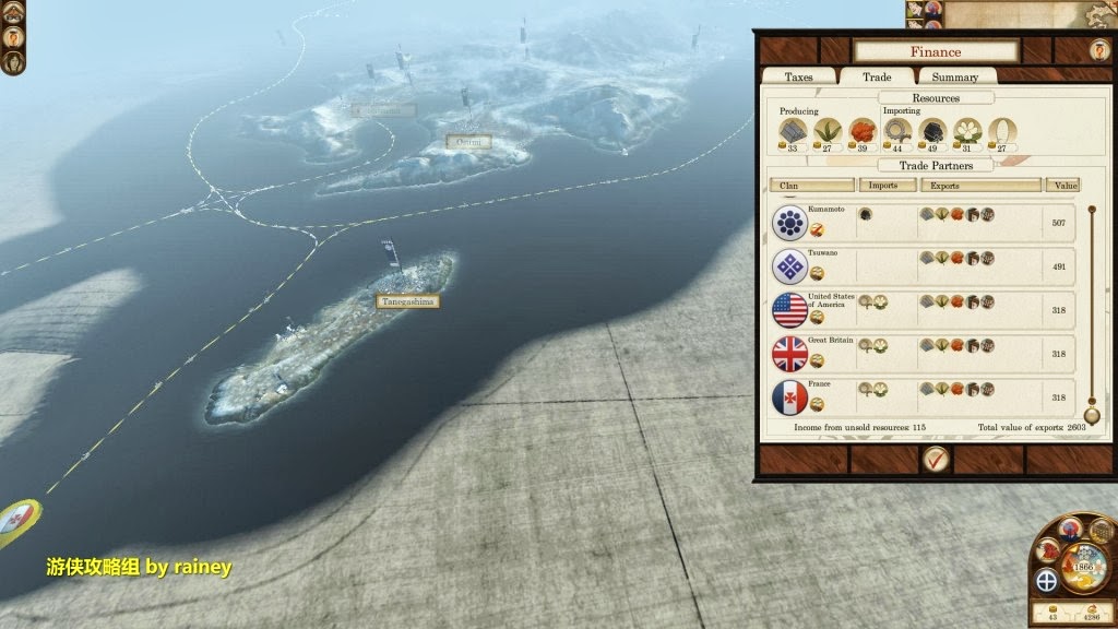 貿易港建立後會自動與3國列強開始貿易,收入還是很可觀的。建議優先發展民用科技,早點開啟貿易,這樣搭配國土稅收和工業發展,每回合收入過5000沒有問題。