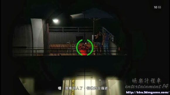 step4.天入夜,小羅會騎著沙灘摩托往飛車族機場大本營的左前方駛去,當他下車後需要用狙擊鏡瞄準一嚇小羅(找不到他也可以)。