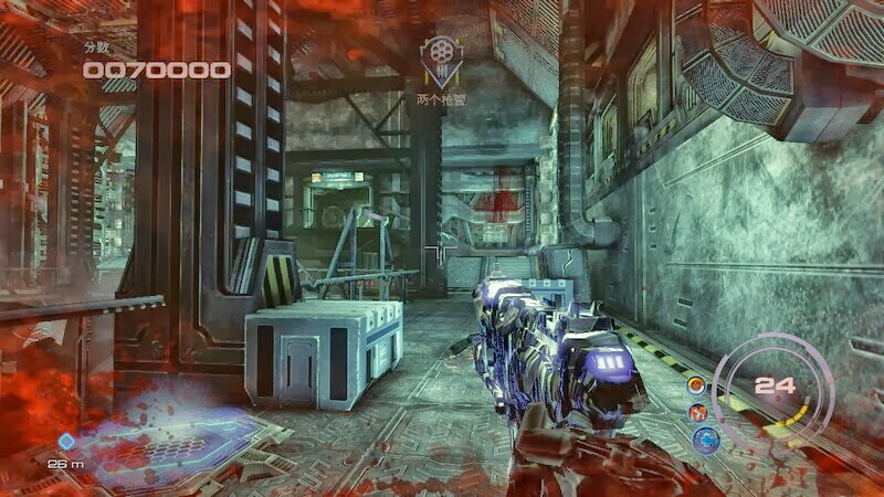 中途會遇到重型外星人槍兵,這種敵人射擊手部的槍,他會一直無法開火。算屈死吧,武器最後會掉落下來,300發的格林機關槍。不過這個是重型武器,無法跑動射擊。