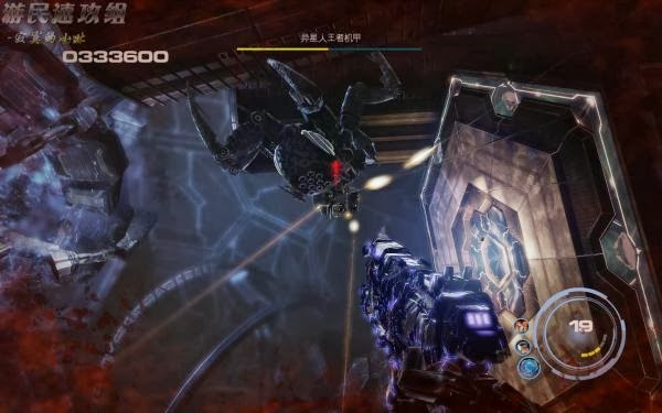 第一階段:射擊其背後的黃色護甲,在這一階段,他會在幾個高臺間跳來跳去。而在其落地後他會有一段硬直時間,我們可以乘機繞道他的後背射他的弱點。