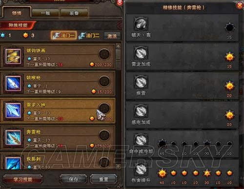 奔雷槍:刷圖神技,傷害必須點滿。(疾雷應該是存在爭議的精修點,這個我選擇它的原因是因為能增加攻速和技能釋放速度。雖然切劍也加攻速,但在技能不是CD或武器藍色靈氣值的時候,我很少切劍。因為我有1000+靈氣值 用完或技能CD時才切劍)