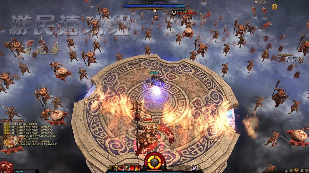 之後要在這個平臺上面打那些天兵天將,那些雜碎都很好解決,只是小心跳過來的時候,地上有標記的地方就是他們的著陸點,被砸到會眩暈,之後他們圍上來一次群攻技能可以全部解決掉……然後打九霄天將,這個boss比較笨,基本上只會用普通攻擊,偶爾放一下火,但是他快掛的時候,會不停的轉,他在轉的時候免疫你的攻擊,而且碰到的傷害還不小……躲開他的攻擊,之後等他停下來了再反擊。