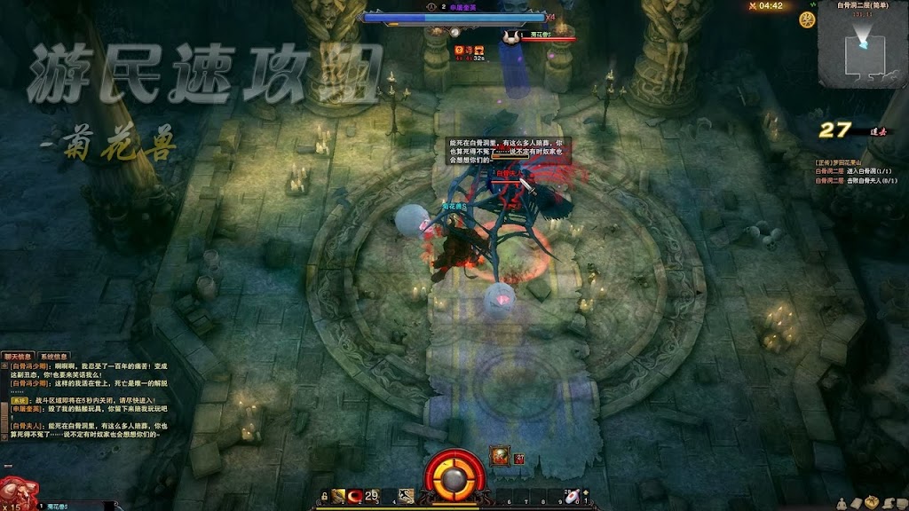 清理小怪還是很輕鬆的,但是仍然要注意一下周圍的落石,之後進入boss戰。分為3個階段,第一階段,只有一個boss——申屠奎英,這個boss比較弱,一出來可以直接進行猛攻,但注意要不時地保持距離,不然會吃他的骷髏頭,骷髏頭召喚出來之後會跟著你,全部命中是很痛的,然後申屠奎英快死了之後,會召喚出白骨夫人,進入第二階段。此時申屠奎英還剩下5排血左右,先繞開白骨夫人將其幹掉,之後打白骨夫人,白骨夫人仍然會放這種骷髏,不過移動速度更快,但不會跟著你,她大概20排血左右,慢慢消耗,之後白骨夫人空血了進入第三階段,此時白骨夫人周圍會出現一層黑色光圈並且免疫所有攻擊,但他不會動了,周圍出現大量小怪,清理這些小怪,否則她會回血。一段時間之後光圈消失,回到第二階段,很快就可以幹掉她。
