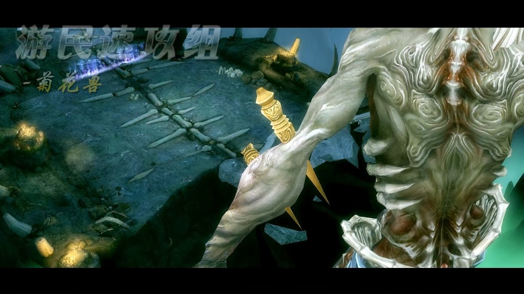 摧毀掉一些骨牆,很快打boss了,這裡這個屏障需要點一下才能過去,之後才能和boss面對面。這個BOSS體型是整個試玩版中最大的,與他的戰鬥中,整個視角也會變得更遠,說來,這個boss的血也算脆皮了,7排,但即便如此,它的傷害不容小覷,之前說到的掉石頭,他也會震東西下來,同樣是那種光暈,到處都是,注意躲避,之後回過去一套連擊,不過要當心他的近戰攻擊,雖然基本上只有1次近戰攻擊的機會,但是還是要小心一些。打死了從他的手上爬過去。